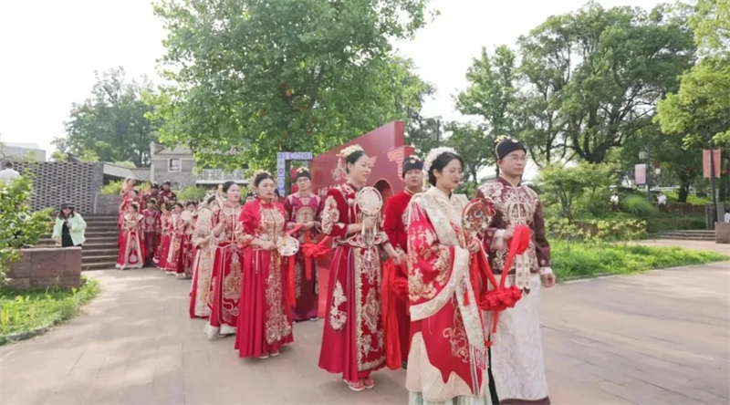 一场古典又浪漫的集体婚礼在湖口县江豚湾公园举行。活动现场布置简约而喜庆,新人在嘉宾和亲朋好友的见证下喜结连理、缔结爱的承诺。拜天地、结发礼、合卺礼、告天礼、新婿描眉……一个个颇具仪式感的环节之后,在现场亲朋好友、嘉宾来客的祝福和掌声中,新人们携手奔赴婚姻殿堂。