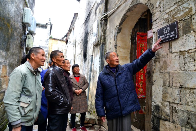 婺源县思口镇思溪村村民金善昌向邻居介绍微家训。新华网发(程新德 摄)